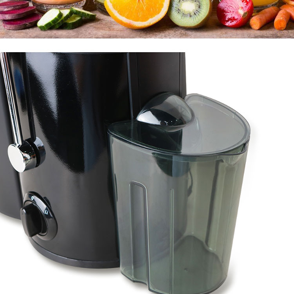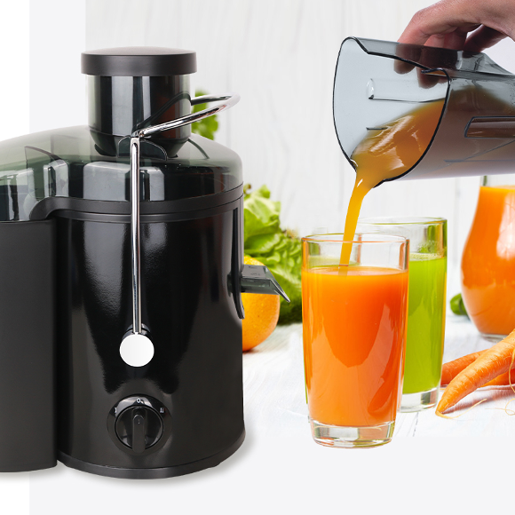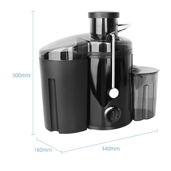 榨汁机;AC120-240V,5060Hz,400W;塑料机身,配SUS410不锈钢装饰件;双档调速;配备安全锁系统;固定式塑料出汁口;投料管直径:65mm;高品质SUS430不锈钢滤网;附带450mlPS材质果汁杯;配备1500mlPP材质接渣桶;带4个防滑垫脚;标配1个果汁杯