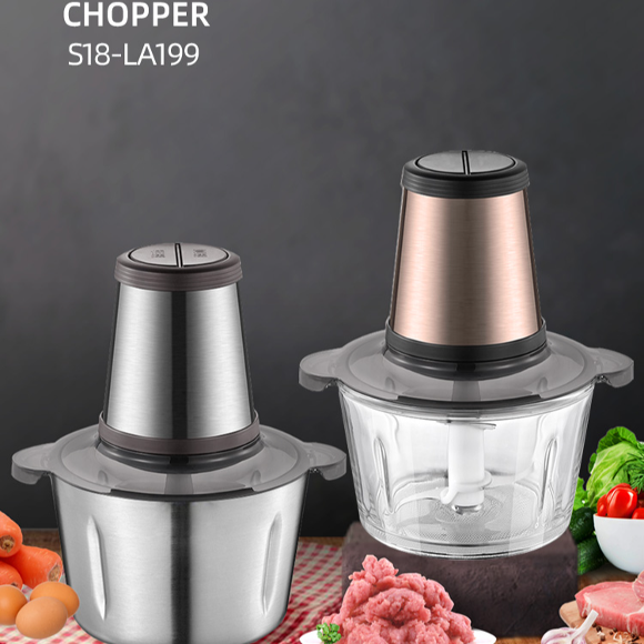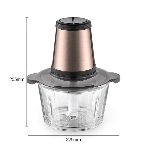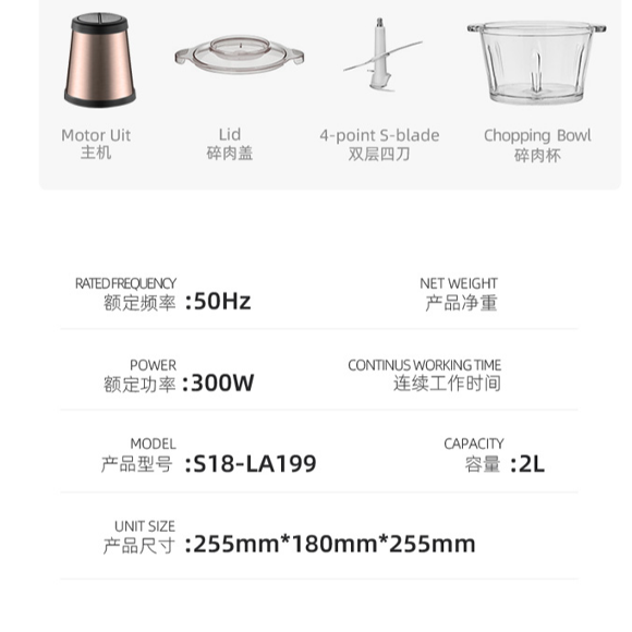 食物切碎机;AC100-240V,5060Hz,350W;不锈钢与ABS塑料组合机身,可选双档调速;1.8L;配置玻璃碗;双刀片设计,便于快速处理食材;金属刀轴及连接件,坚固耐用;配备防滑垫